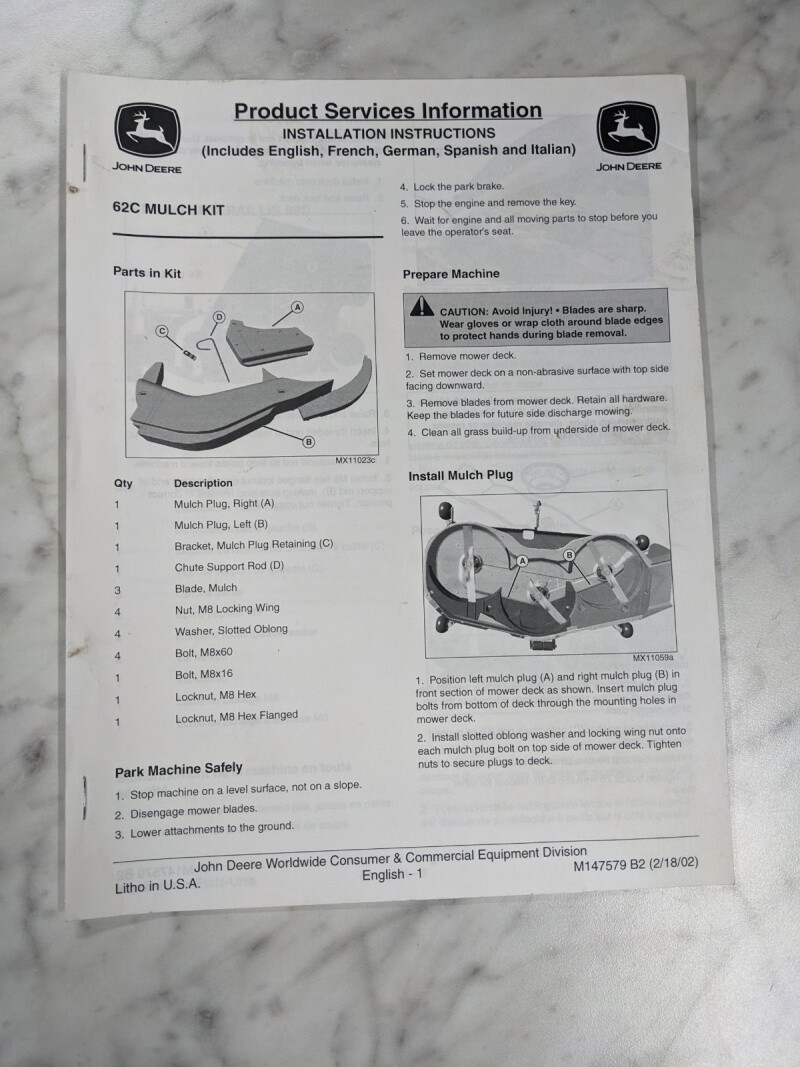 John Deere Operator Installation Instruction Manual 62C Mulch Kit M147579