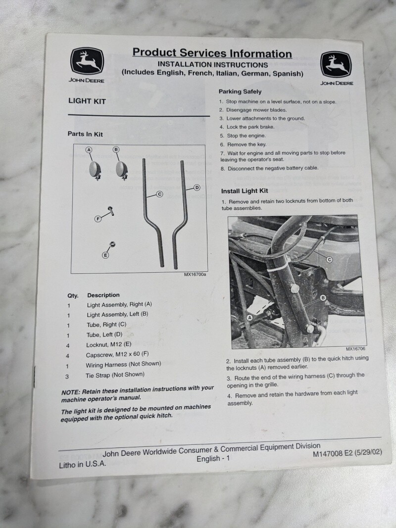 John Deere Operator Installation Instruction Manual Light Kit M147008 2002