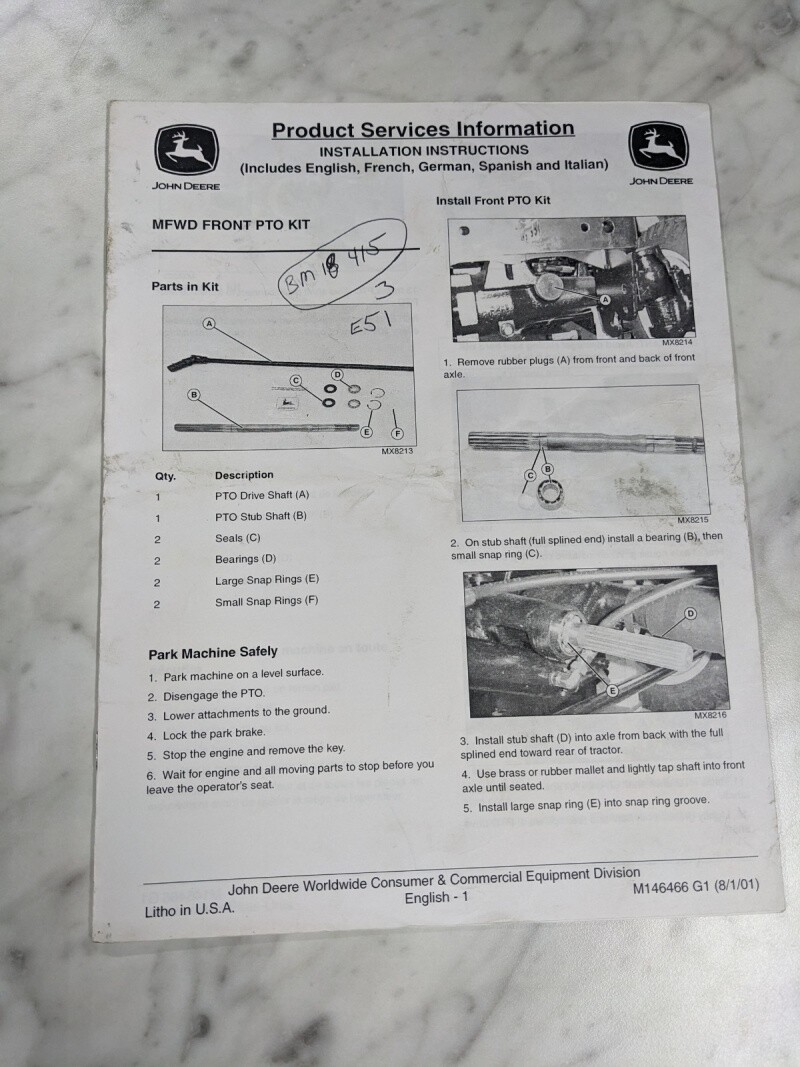 John Deere Operator Installation Instruction Manual Mfwd Front Pto Kit M146466