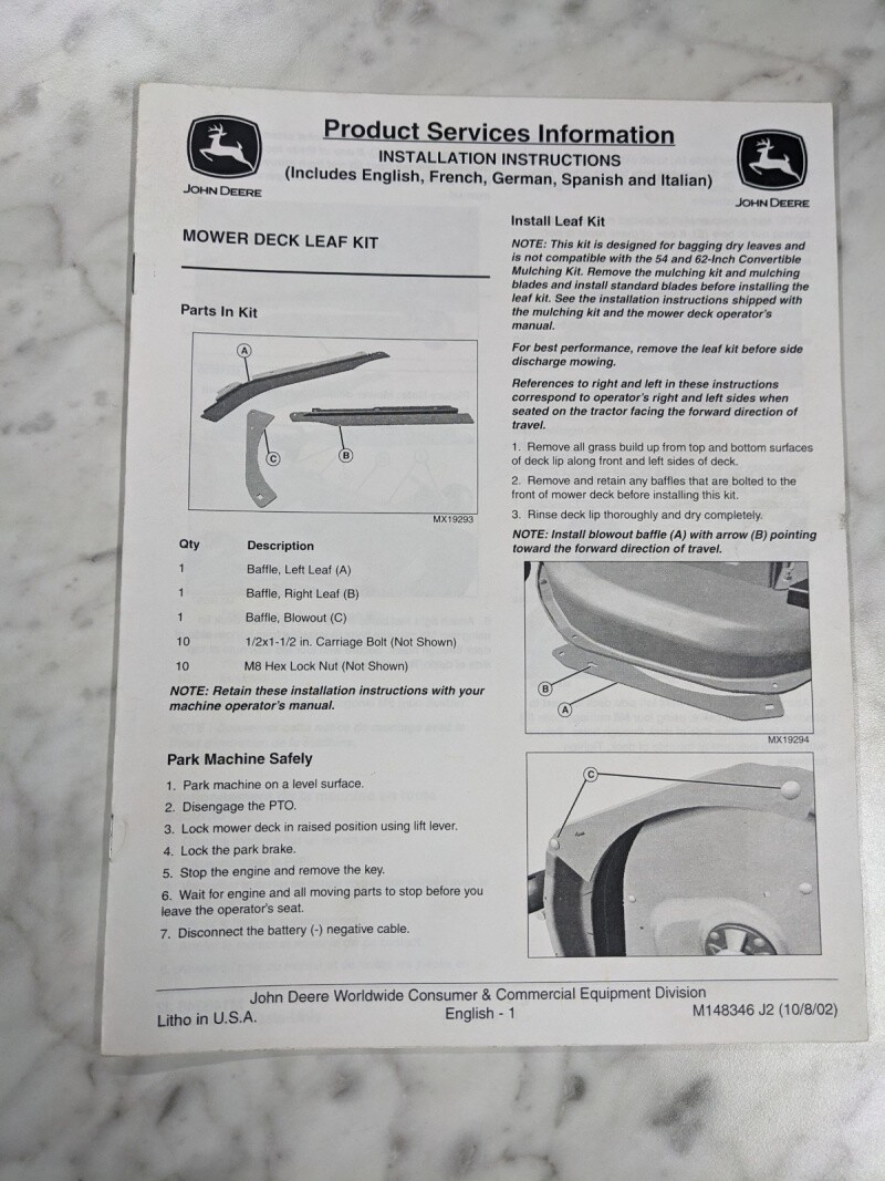 John Deere Operator Installation Instruction Manual Mower Deck Leaf Kit M148346