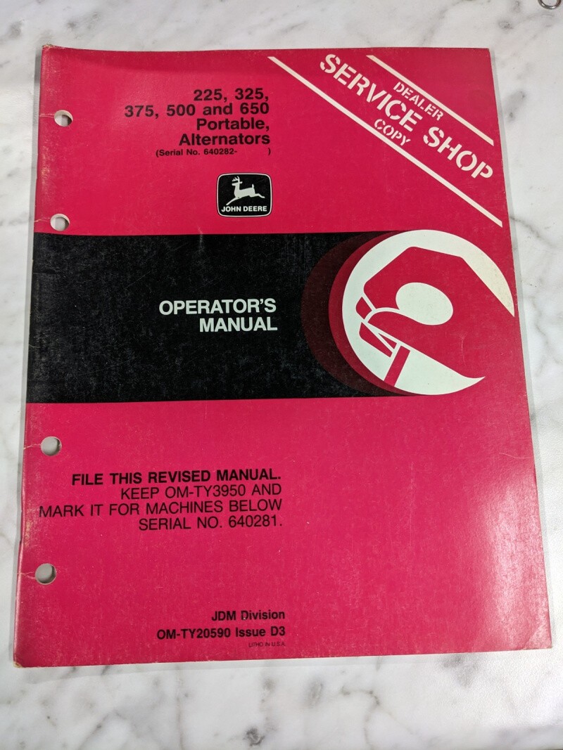 John Deere Operator Manual 225 325 375 500 650 Portable Alternator Om-Ty20590 D3