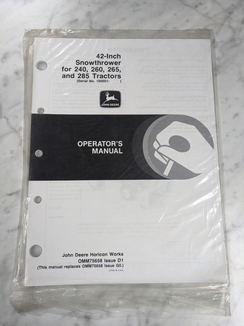 John Deere Operator Manual 42” Snowthrower 240 260 265 285 Tractor Omm75658 D1