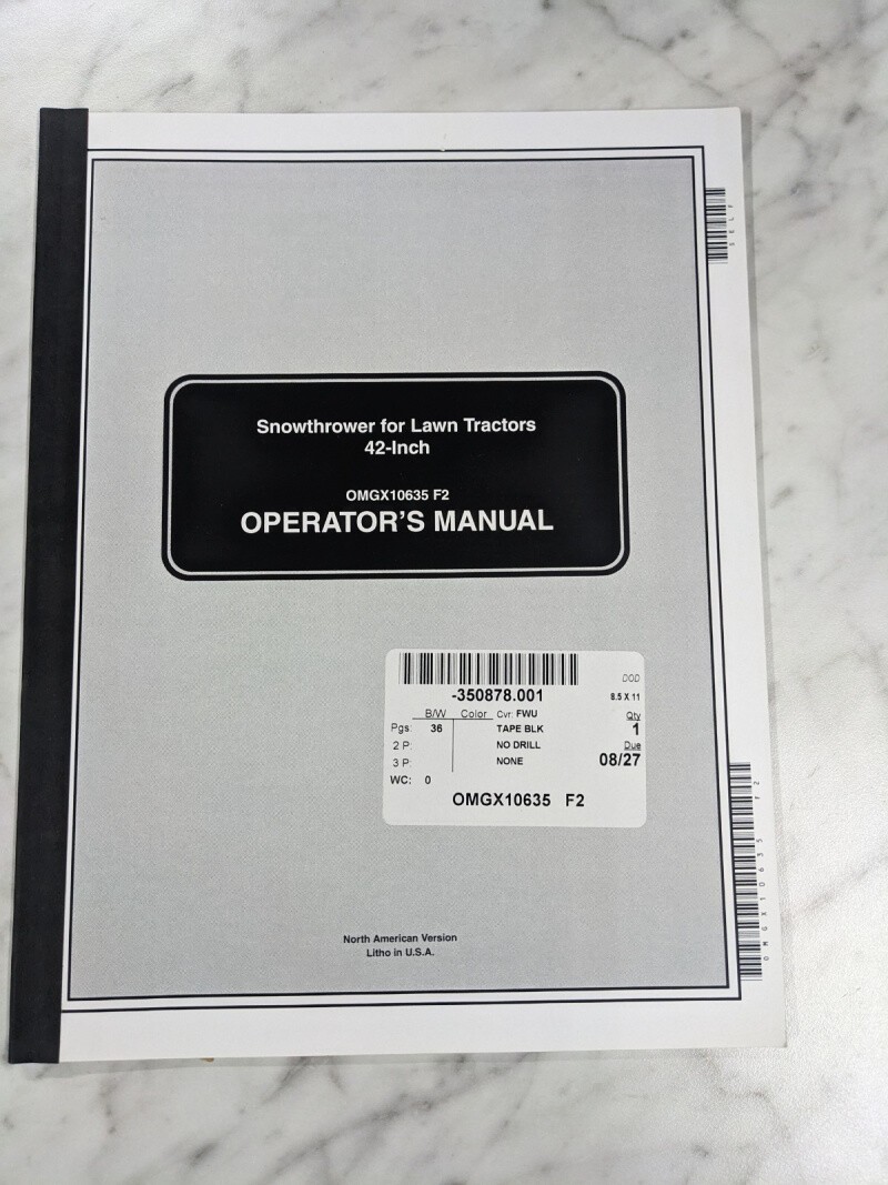 John Deere Operator Service Manual 42” Snow Thrower Lawn Tractor Omgx10635
