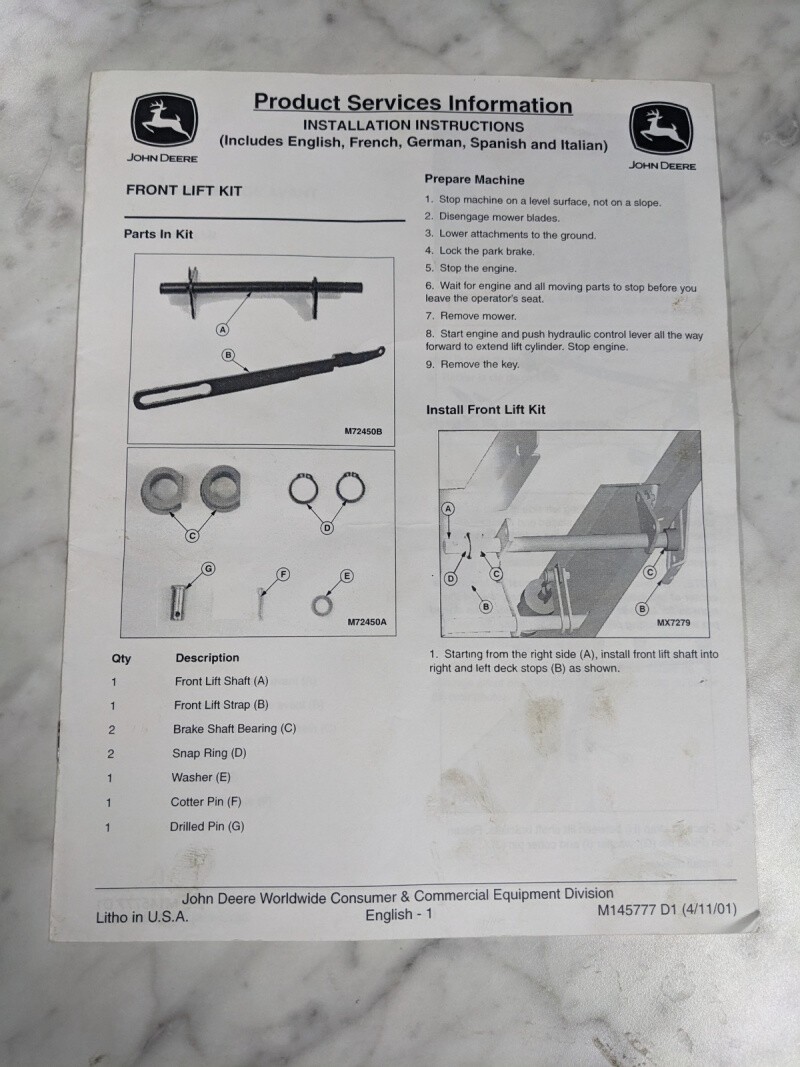 John Deere Service Installation Instruction Manual Front Lift Kit M145777