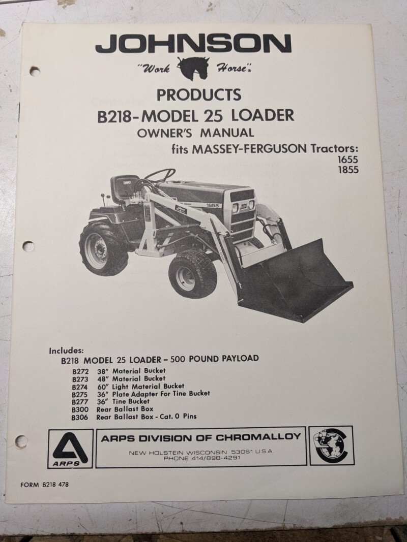 Johnson Work Horse 25 Loader Tractor B218 1655 1855 Massey Ferguson Parts Manual