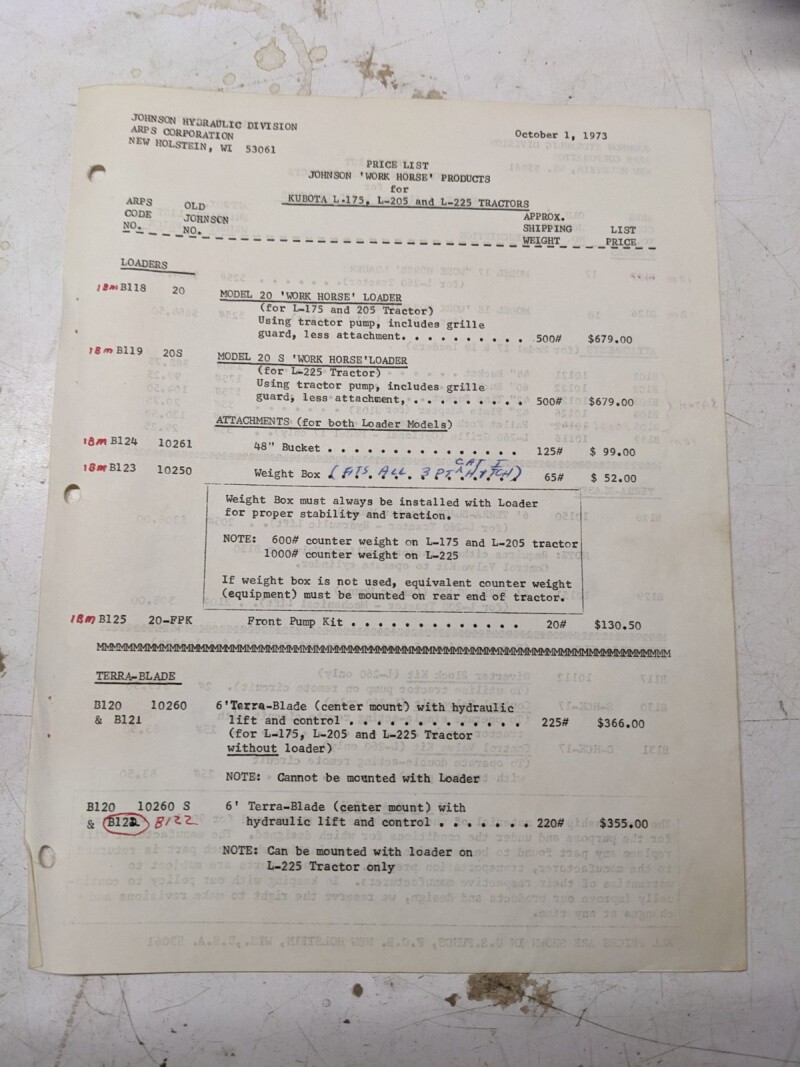 Johnson Work Horse Loader Model 20 Kubota L-175 205 225 Tractor Price List