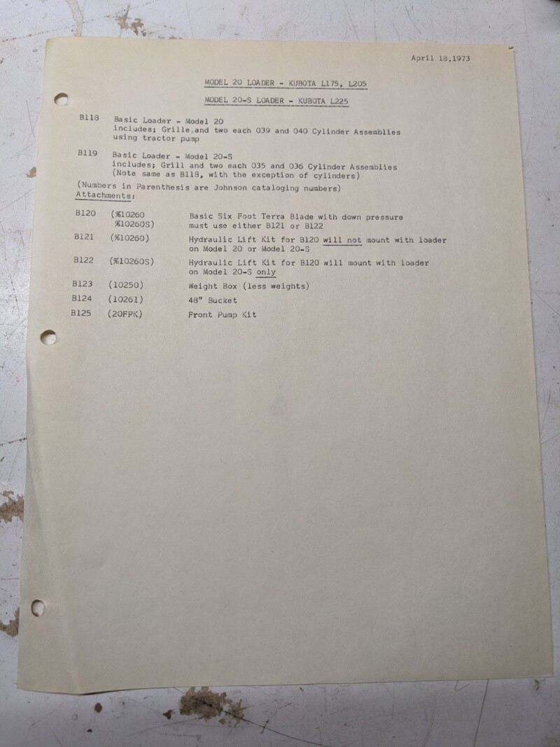 Johnson Work Horse Product Model Loader Kubota L175 20 -S L225 Kit Listing 1973