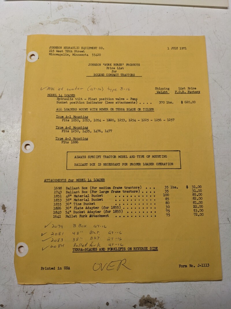 Johnson Work Horse Products Bolens Compact Tractors Price List 1971 Attachment