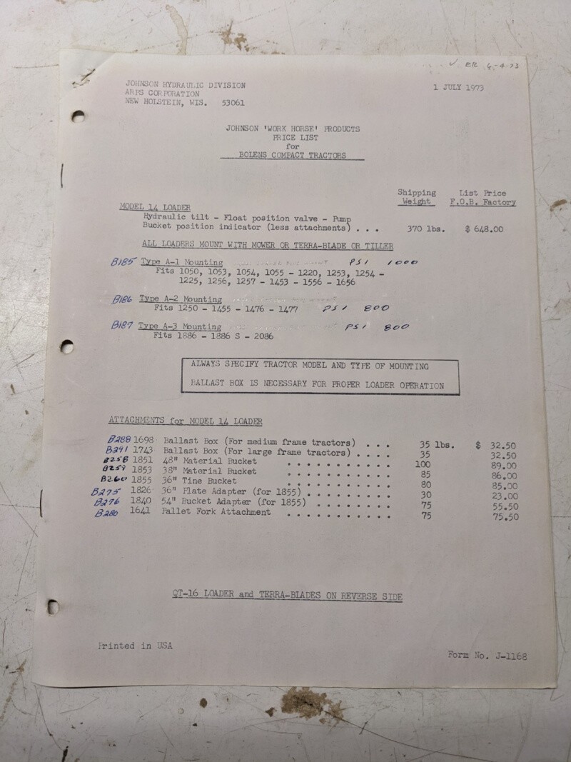 Johnson Work Horse Products Bolens Compact Tractors Price List 1973 Attachment