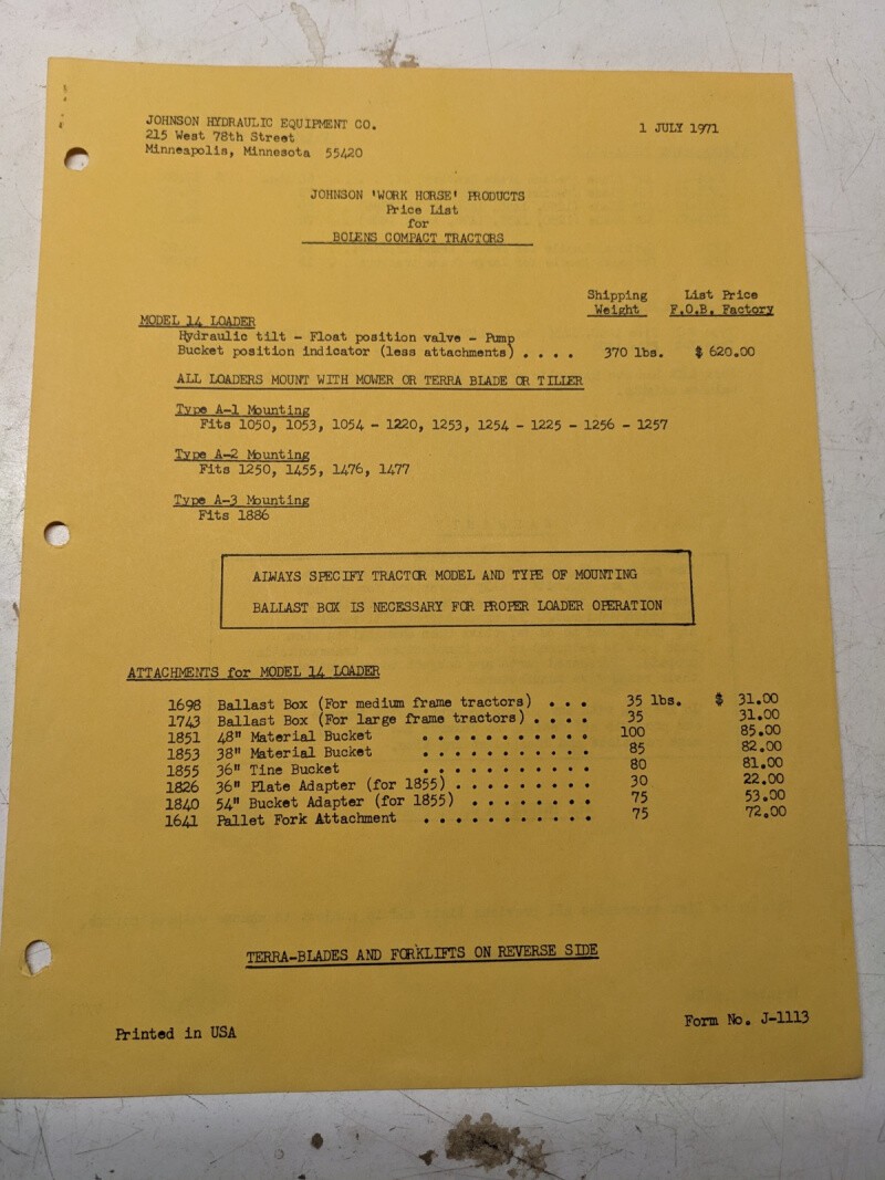 Johnson Work Horse Products Bolens Compact Tractors Price List ’71 Attachment
