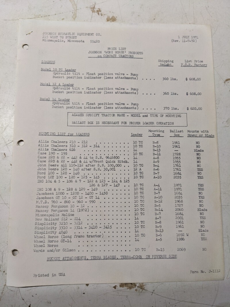 Johnson Work Horse Products For Compact Tractors Price List July 1971 Attachment