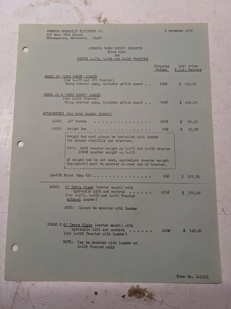 Johnson Work Horse Products Kubota L175-225 Compact Tractors Price List 1972 Nov