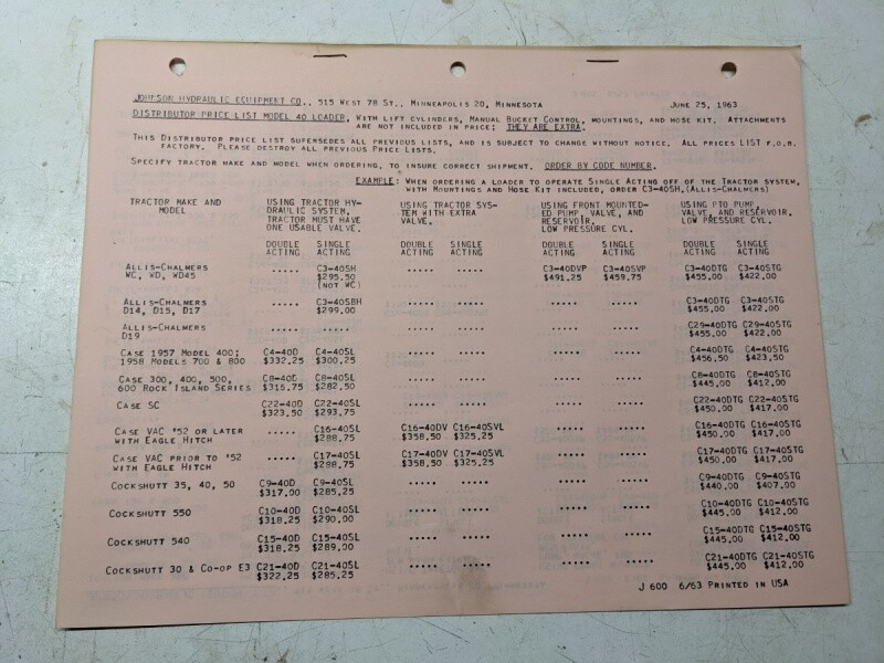 Johnson Work Horse Products Model 40 Loader Tractor Price List 6/1963 Attachment