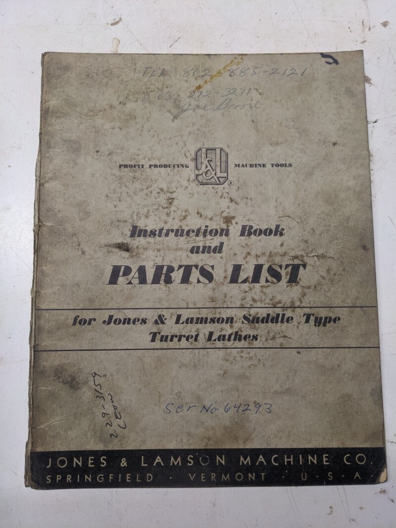 Jones & Lamson Instructions Book Parts List Manual Saddle Turret Lathe