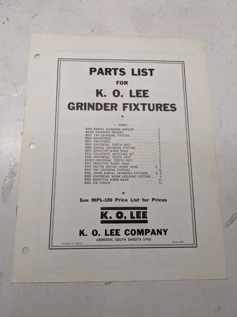 K O Lee Repair Parts List Book Catalog Manual For Grinder Fixtures B269-B994