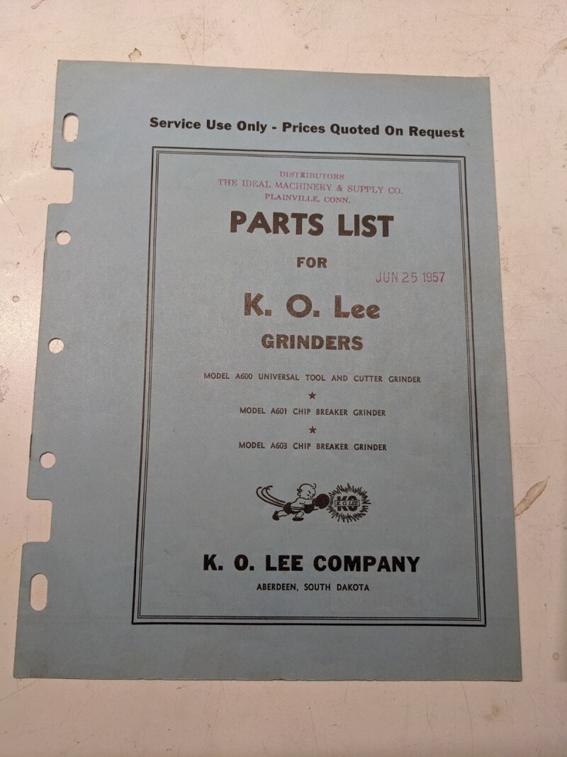 K O Lee Repair Parts List Book Catalog Manual Surface Grinders A600 601 603 1957