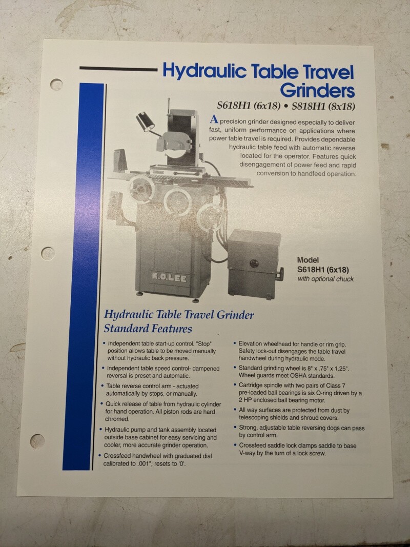 K.O. Lee Tool Sales Brochure Specs Features Hydraulic Grinder S618H1 S818H1 1995