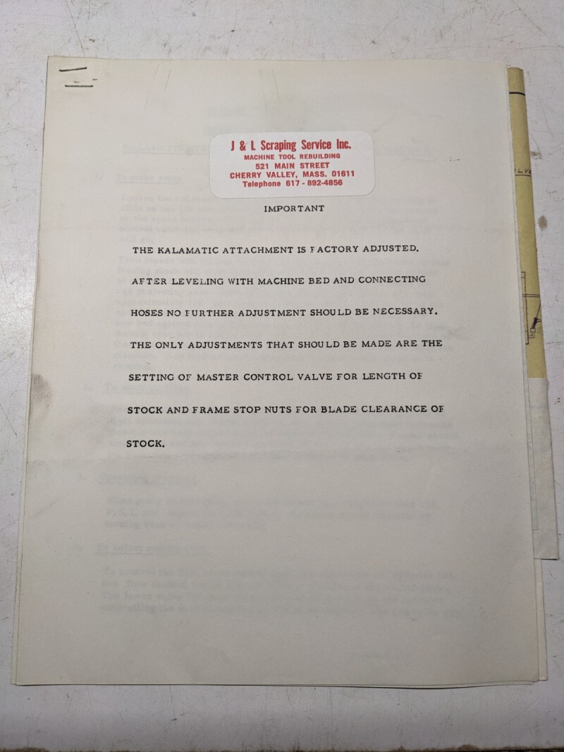 Kalamazoo Band Saw Kalamatic Attachment Bar Feed Model B Operation Manual
