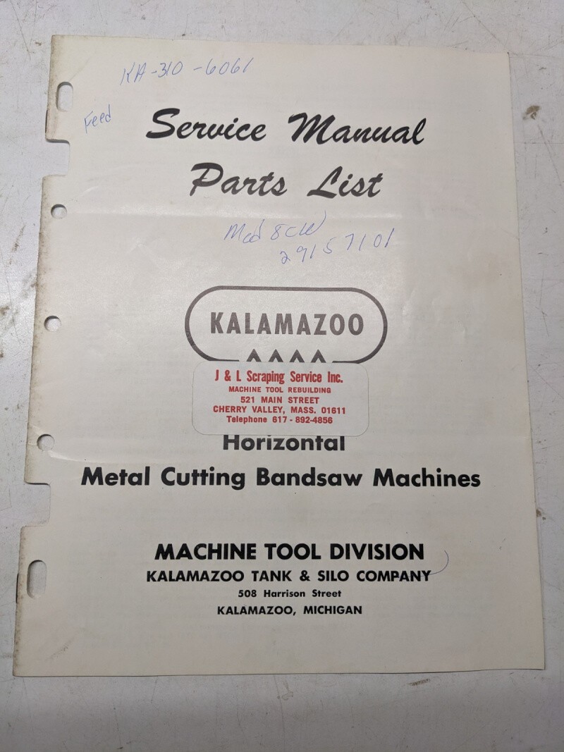 Kalamazoo Band Saw Machine Repair Service Manual Parts Book 610 816 824 8C 1220