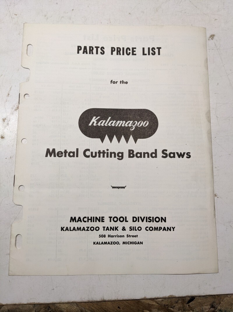 Kalamazoo Band Saw Machine Tool Parts Price List 8C 816 824 1220 610 Model