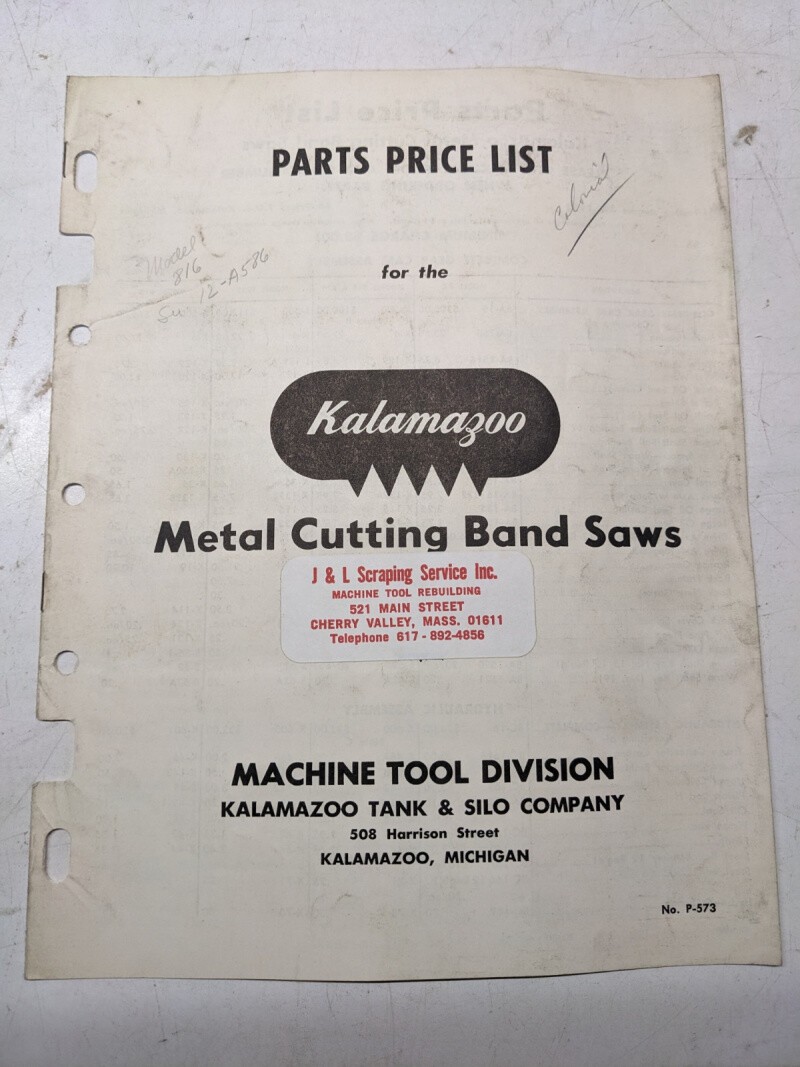 Kalamazoo Band Saw Tool Parts Price List #P-573 1953 Metal Cutting Machine