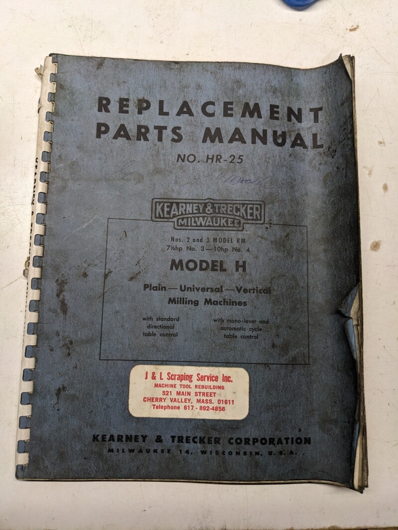 Kearney Trecker Milwaukee Repair Parts List Book Manual # Hr-25 Model H Milling