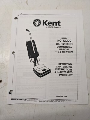 Kent Operating Maintenance Manual Parts List Book Kc-120 Kdc Upright Vacuum 1992