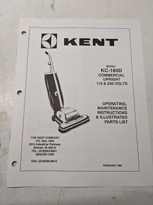Kent Operating Maintenance Manual Parts List Book Kc-165D Upright Vacuum 1992