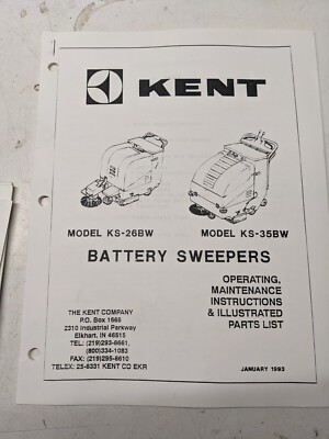 Kent Operating Maintenance Manual Parts List Book Ks-26Bw Ks-35Bw 1993 Sweeper