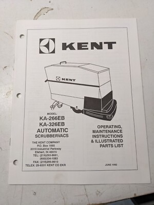 Kent Operating Maintenance Manual Parts List Book Scrubbervac Ka 266 326 Eb 1992