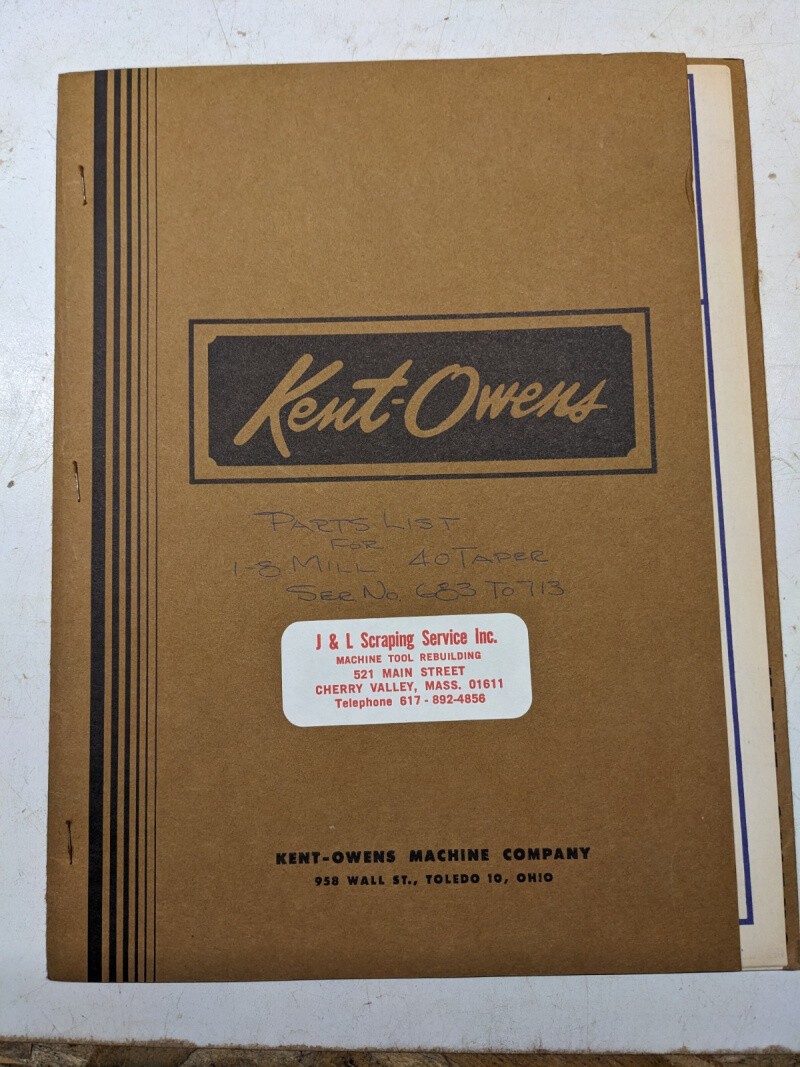 Kent-Owens Milling Machine #1-8 #40 Taper Part List Manual Book Illustrated