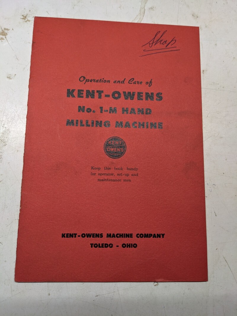 Kent Owens Operator Maintenance Service Manual #1-M Hand Milling Machine Shop