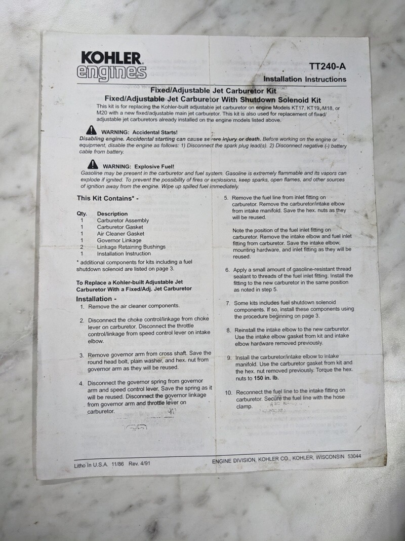 Kohler Engine Installation Instruction Tt240-A Caburetor Kit Shut Down Solenoid