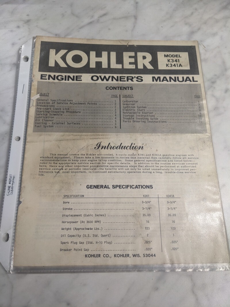 Kohler Engine Owners Manual K341 K341A Ens-921 Maintenance Operation Adjustment
