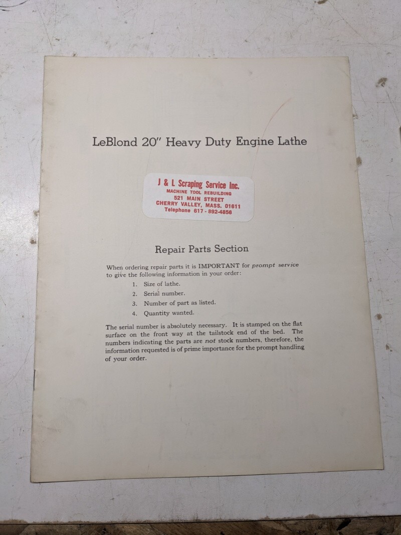 Leblond Lathes Repar Parts List Book Catalog Manual 20” Heavy Duty Engine