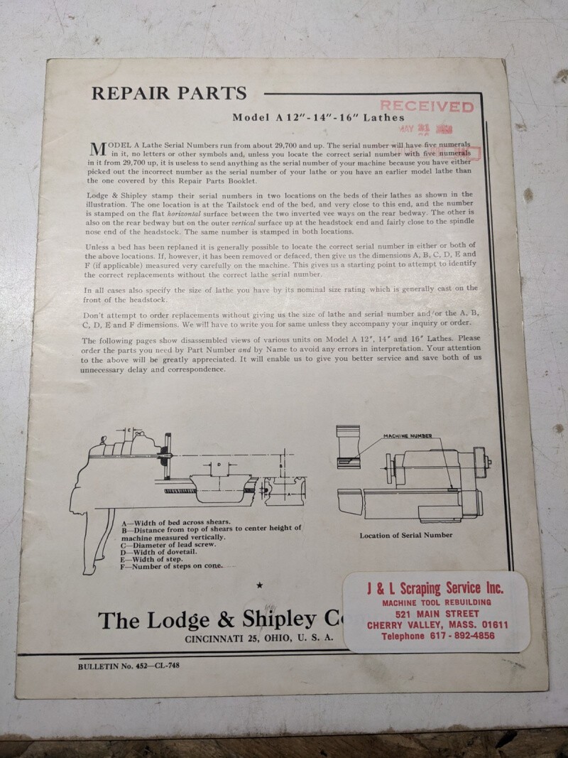 Lodge & Shipley Lathes Repair Parts List Book Manual Catalog A 12” 14” 16”