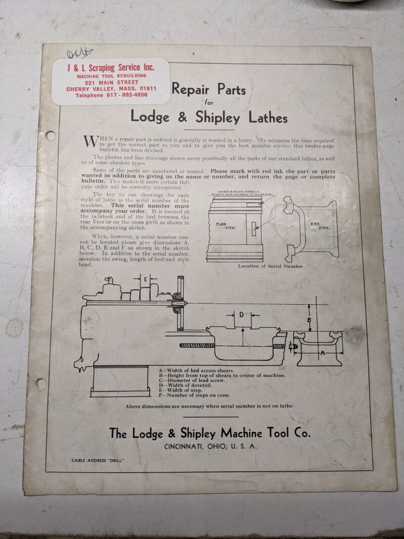 Lodge & Shipley Lathes Repair Parts List Book Manual Catalog