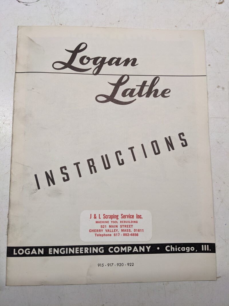 Logan Lathe Instructions Manual Model 915 917 920 922 Shop Book Operation 1952