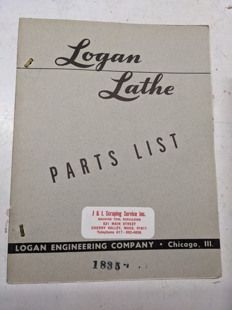 Logan Lathe Repair/Service Parts List Shop Book Manual Catalog #1835-2 1954