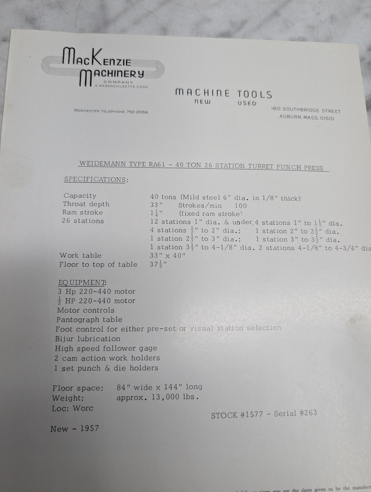 Mackenzie Weidemann Type Ra61 40 Ton 26 Station Turret Punch Press New 1957