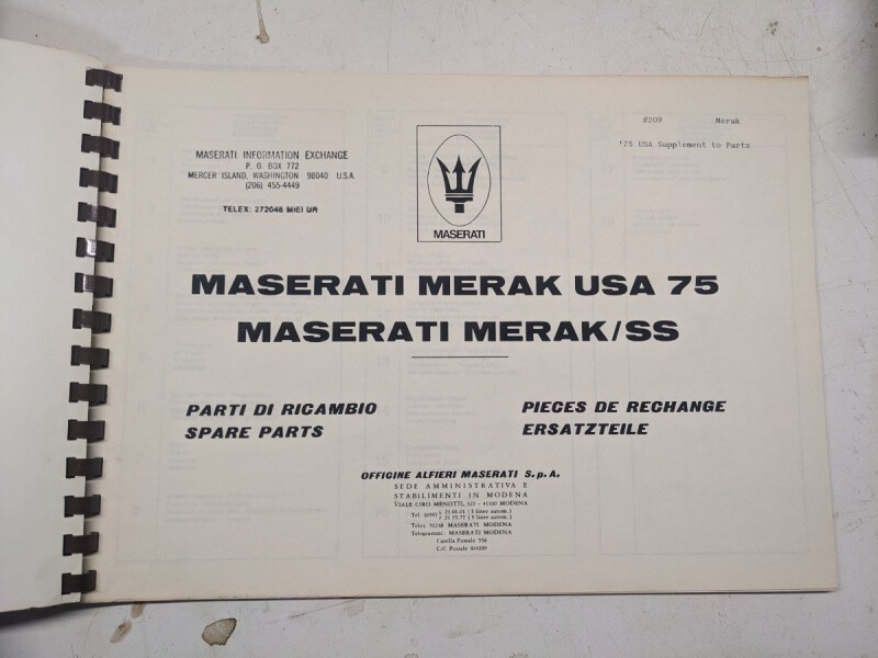 Maserati Merak Spare Parts List Book Manual Catalog #209 Supplement Usa 75 / Ss