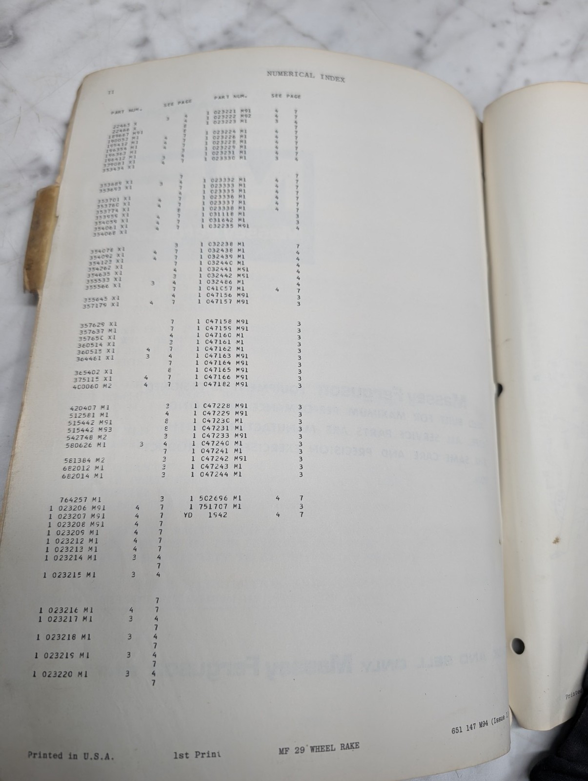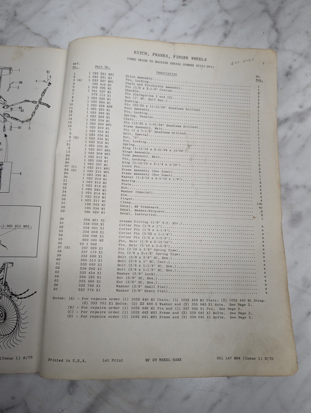 Massey Ferguson Mf 29 Fingerwheel Rake Form No 651 147 M94 Parts Book