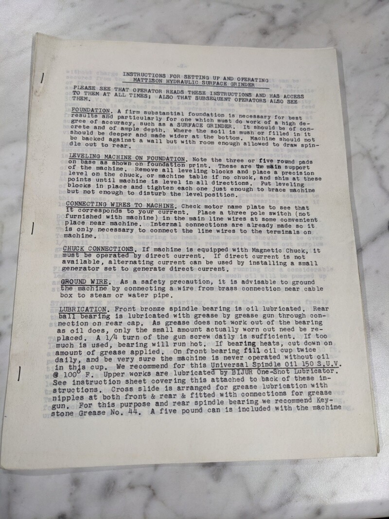 Mattison Hydraulic Surface Grinder Operator Setup Instruction Manual Maintenance
