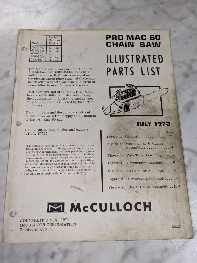 Mcculloch Chain Saw Illustrated Parts List Manual Catalog Pro Mac 60 1973 89321