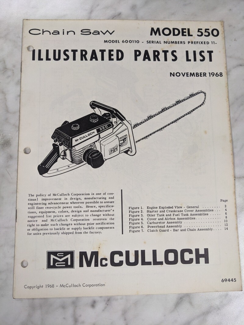 Mcculloch Chain Saw Parts List Illustrated Manual Catalog Model 550 69445 1968
