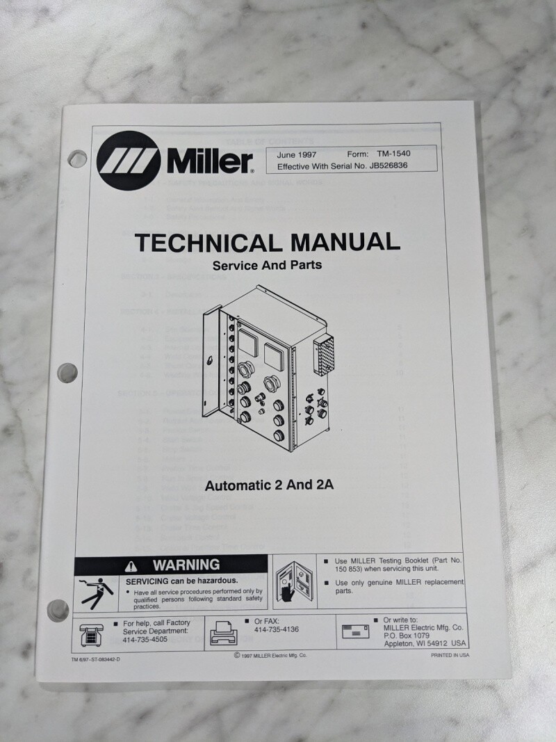 Miller Welder Service Technical Manual Parts List Automatic 2A Tm-1540 1997