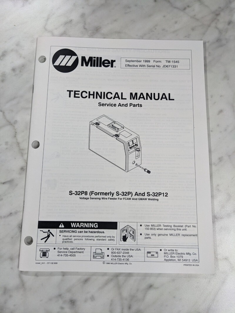 Miller Welder Service Technical Manual Parts List S-32P12 Tm-1545 1999