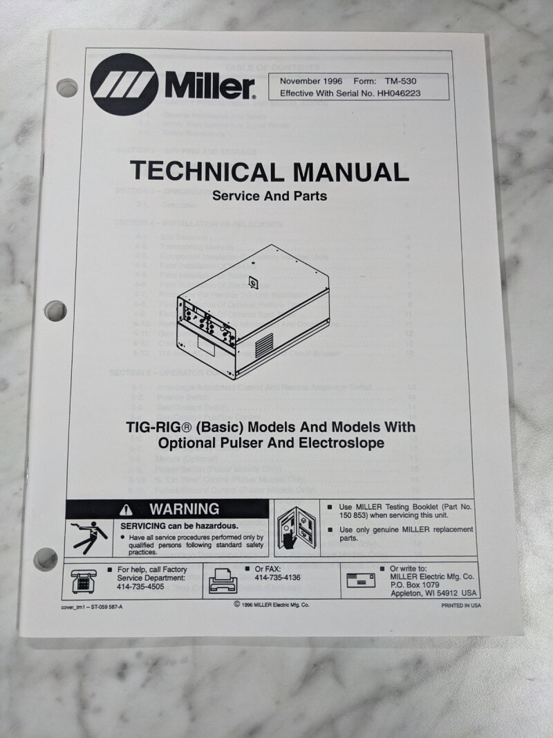 Miller Welder Service Technical Manual Parts List Tig-Rig Basic Tm-530 1996