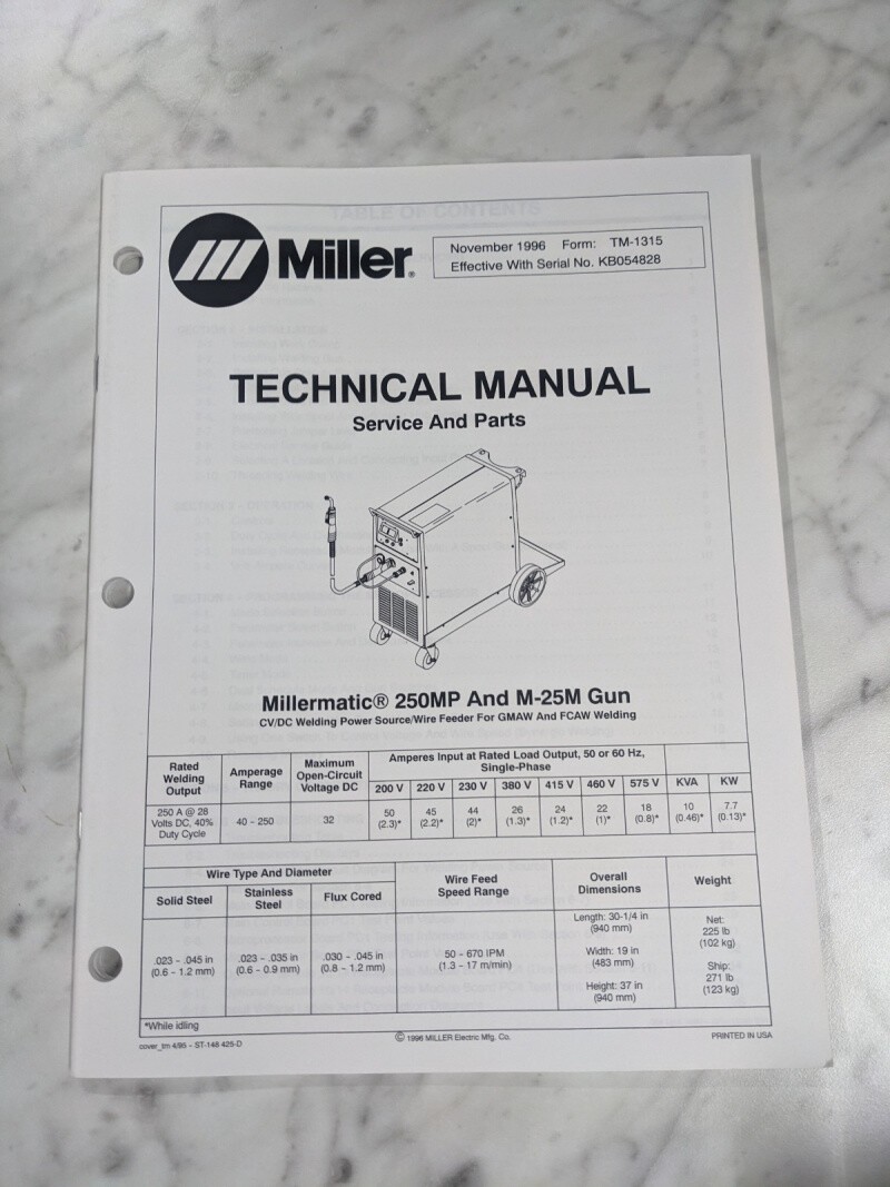 Miller Welder Techinical Service Manual Part List Millermatic 250Mp Tm-1315 1996