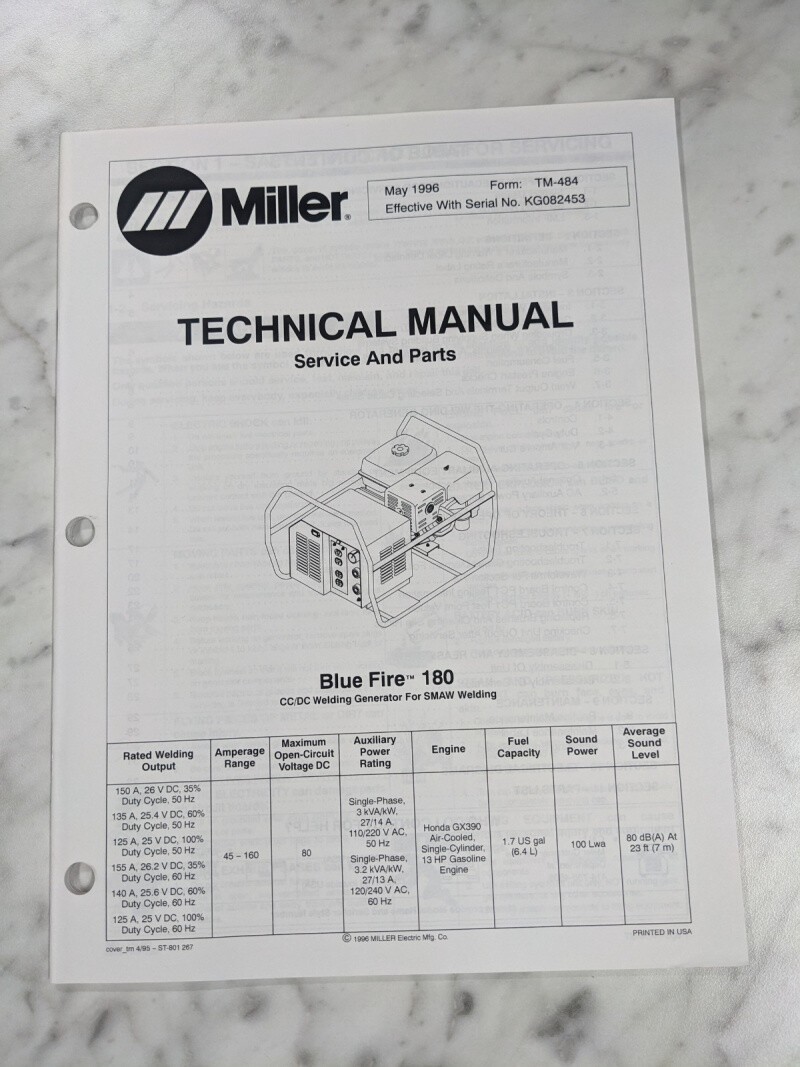 Miller Welder Techinical Service Manual Parts List Blue Fire 180 Tm-484 1996